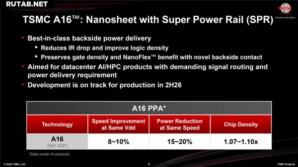Ключевым обновлением станет переход на передовой 1.6-нм техпроцесс TSMC A16. Помимо архитектуры транзисторов GAA (Gate-All-Around), эта технология впервые для TSMC будет использовать технологию питания с обратной стороны кристалла (SRP). Это позволит повысить плотность размещения элементов, производительность и эффективность энергоснабжения.