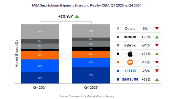 Согласно новому отчёту аналитического агентства Counterpoint Research, в четвёртом квартале 2025 года рынок смартфонов на Ближнем Востоке и в Африке (MEA) вырос на 5% в годовом исчислении, продолжив стабильный рост уже третий квартал подряд.