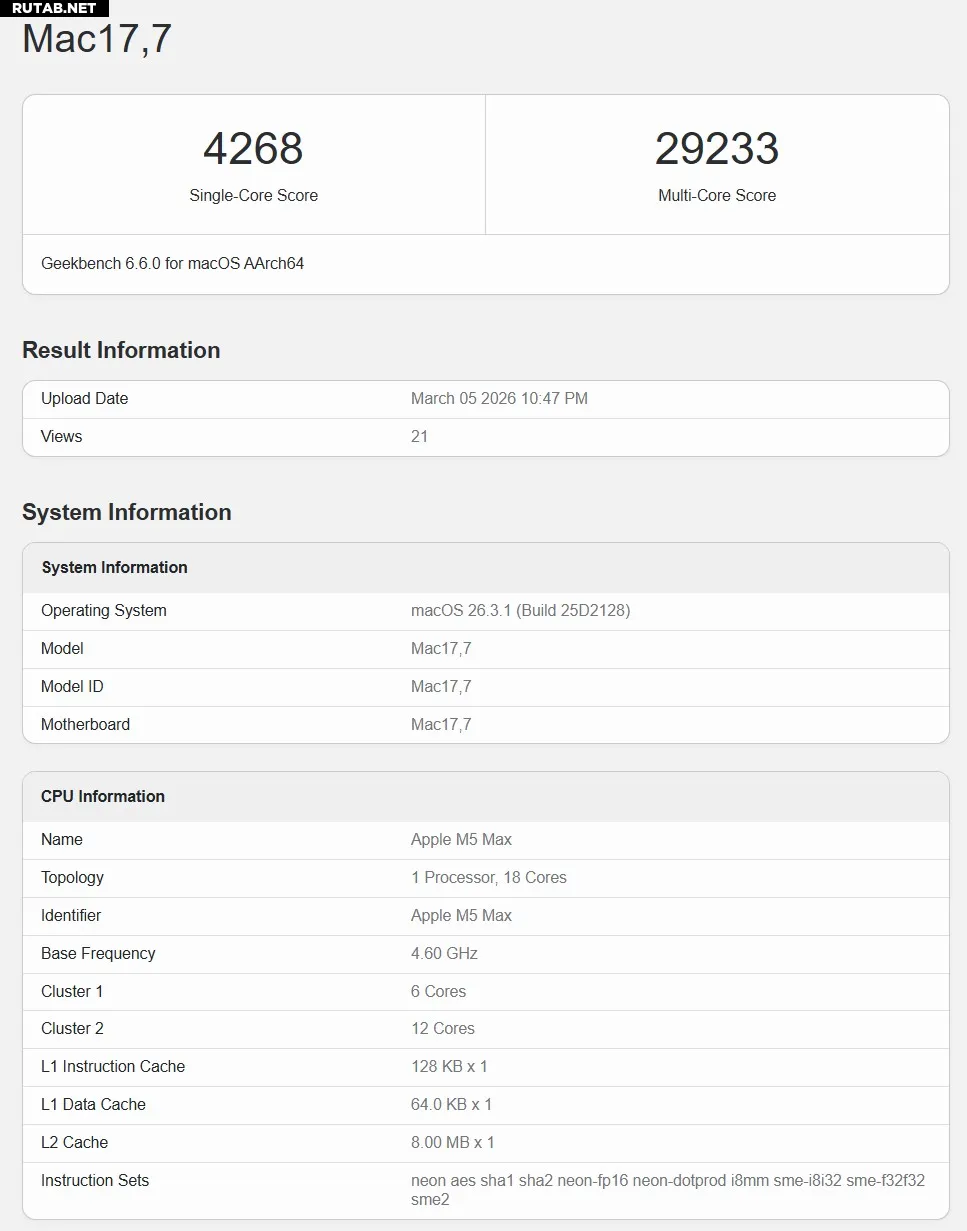 В сравнении с прошлогодней моделью M4 Max (16 ядер) различия менее впечатляющие. M5 Max на 5,4% быстрее в однопоточном тесте и на 10,3% лучше в многопоточном. Для многих пользователей, недавно перешедших на серию M4, такой небольшой скачок может быть аргументом против немедленной замены оборудования. Однако для тех, кто работает на более старых машинах или нуждается в максимально возможной производительности в мобильной форме, M5 Max становится новой точкой отсчета.