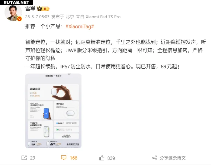 Основатель Xiaomi Лэй Цзюнь в своём блоге представил новый компактный аксессуар компании — Xiaomi Tag. Это первое устройство Xiaomi, разработанное специально для предотвращения потери вещей.