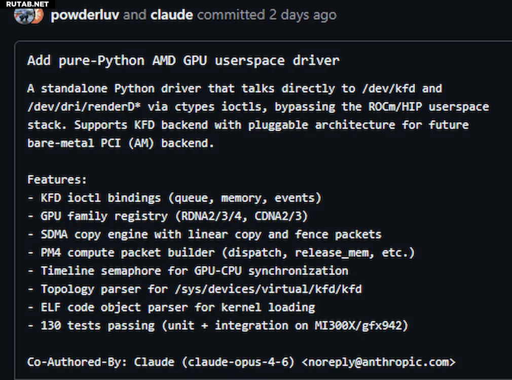 Такой подход полезен для отладки и экспериментов, позволяя инженерам изолировать ошибки или тестировать функции GPU, не компилируя огромные проекты на C++. В коде также упоминается «подключаемая архитектура для будущего bare-metal PCI (AM) бэкенда», что указывает на возможность тестирования оборудования на ещё более низком уровне, в обход драйвера ядра.