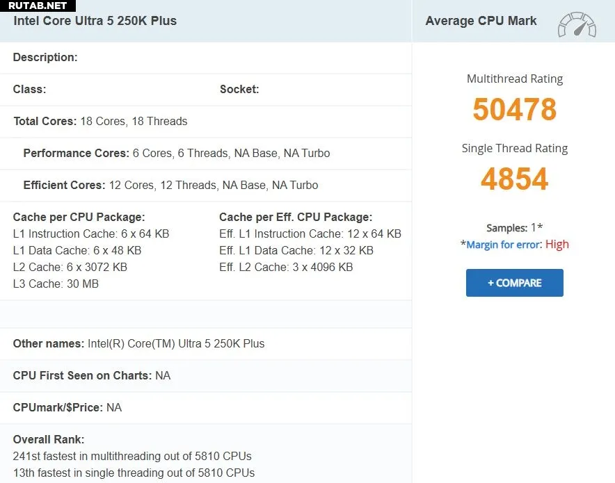 Важно отметить, что в базе PassMark на данный момент присутствует лишь один результат тестирования Core Ultra 5 250K Plus, поэтому точность данных требует дополнительного подтверждения при появлении большего количества образцов.