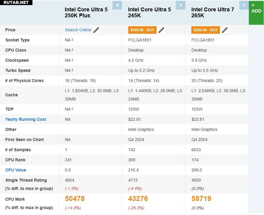 Согласно утечкам, линейка Arrow Lake Refresh будет включать три модели: Ultra 7 270K Plus, Ultra 5 250K Plus и Ultra 5 250KF Plus. Модели 250K Plus и 250KF Plus идентичны по характеристикам и отличаются только наличием встроенного графического ядра.