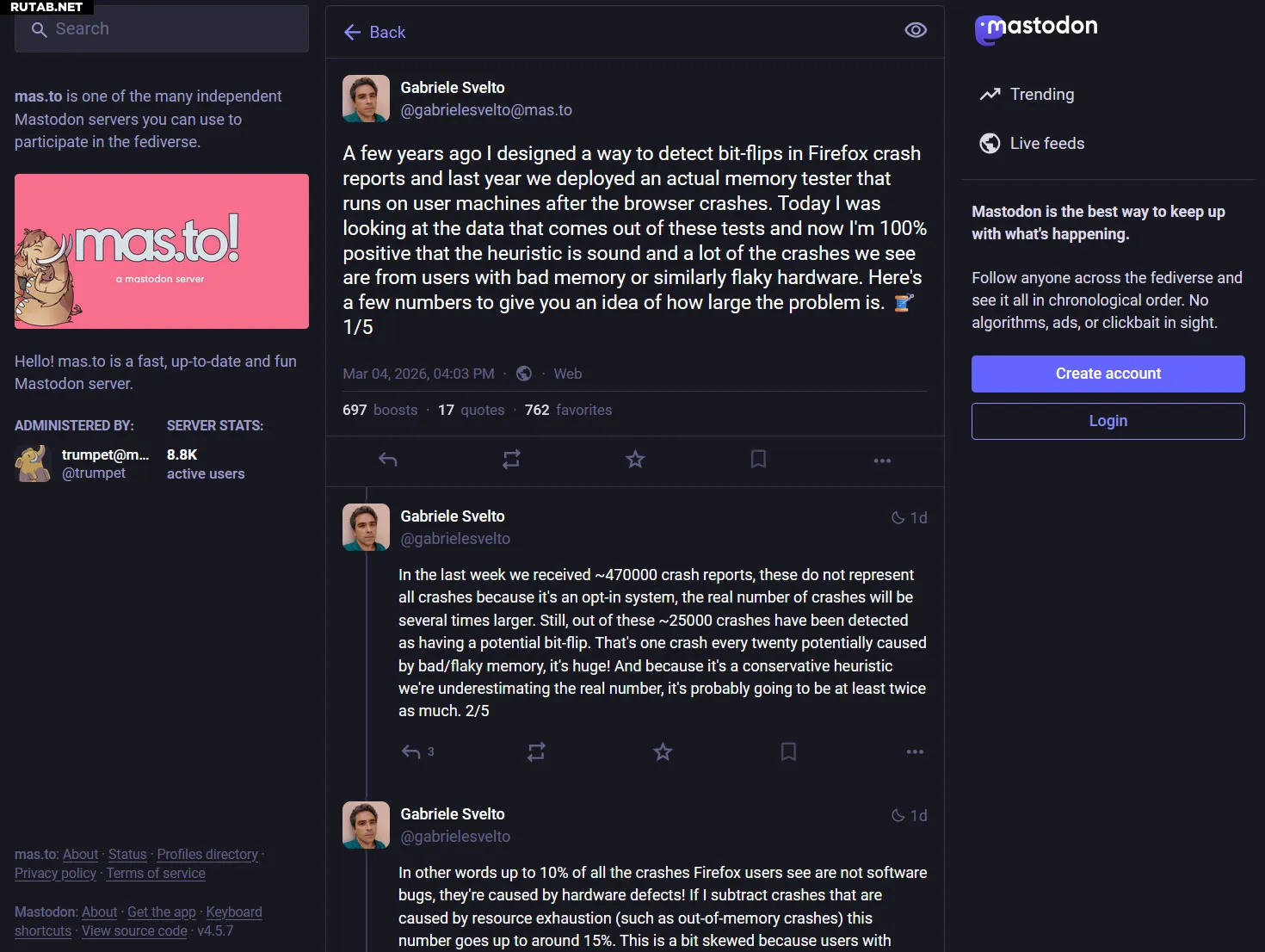 Команда Mozilla на прошлой неделе получила почти полмиллиона автоматически отправленных отчётов о сбоях (функция, включённая по желанию пользователя). Данные от недавно внедрённого «тестера памяти, который запускается на машинах пользователей после краха браузера», привели старшего инженера Габриэле Свельто к ошеломляющей цифре в 15%. Он признаёт, что эта цифра «затмевает все предыдущие оценки, которые я видел относительно этой проблемы».