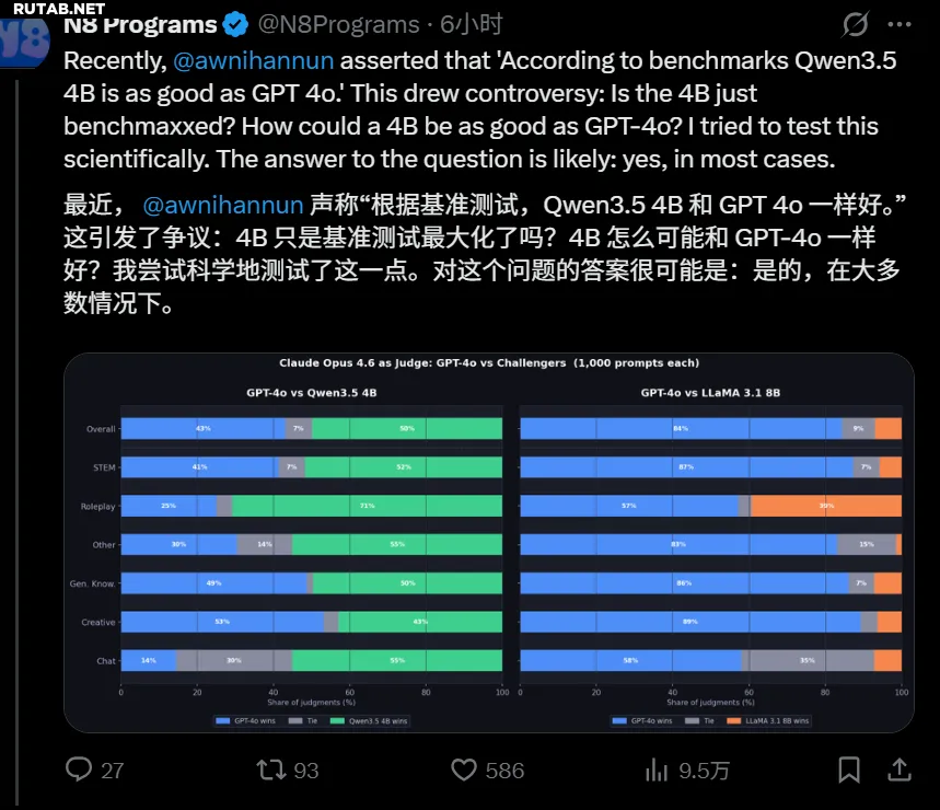 Для проверки было использовано 1000 случайных вопросов из набора данных WildChat. Ответы обеих моделей оценивались с помощью самой мощной на данный момент модели Opus 4.6. В итоге Qwen 3.5-4B выиграла в 499 случаях из 1000, проиграла в 431 и свела вничью 70 раундов. Это подтверждает, что заявления разработчиков Qwen соответствуют действительности.