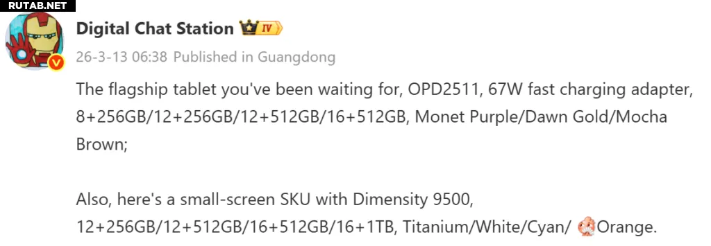 Ранее в этом месяце инсайдер Digital Chat Station подтвердил существование компактного планшета, который, предположительно, получит название Oppo Pad Mini. Согласно утечке, устройство будет конкурировать на китайском рынке с такими небольшими игровыми планшетами, как Redmi K Pad 2, Red Magic Gaming Tablet 5 Pro и Lenovo Legion Y700 (2026). Теперь инсайдер вернулся с новой информацией, проливающей свет на возможные конфигурации и цветовые варианты планшета, а также на смартфон Oppo Find X9s Pro.