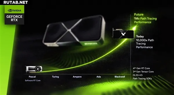 В преддверии конференции разработчиков игр GDC 2026 компания NVIDIA не представила новых игровых видеокарт (серия RTX 50 SUPER, по слухам, отменена), но поделилась любопытным слайдом из презентации. На нем заявлено, что производительность трассировки лучей в архитектуре Blackwell (ожидаемой в серии RTX 50) уже в 10 000 раз выше, чем у предшественника, а в будущем этот показатель может вырасти до ошеломляющих 1 000 000 раз.