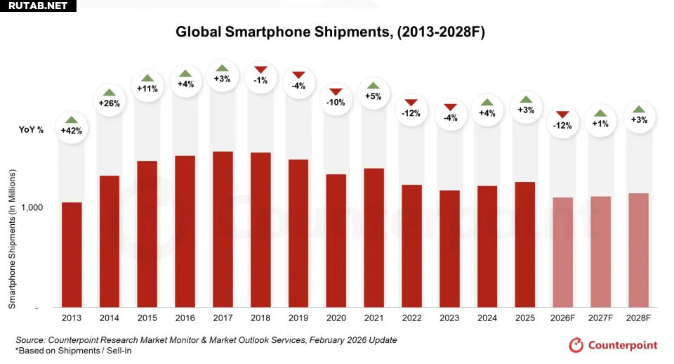 Анализ данных показывает, что мировые поставки смартфонов, как ожидается, сократятся на 12,9% в годовом исчислении в 2026 году, при этом объем рынка уменьшится примерно на 160 миллионов единиц. Это станет самым большим падением почти за десятилетие.