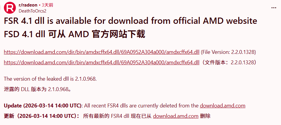 Согласно данным из публичного каталога загрузок AMD, репозиторий с этим файлом был обновлён 11 марта. В подпапках хранятся две версии DLL-файла: от 2 марта (13,8 МБ) и от 12 марта (16,8 МБ).