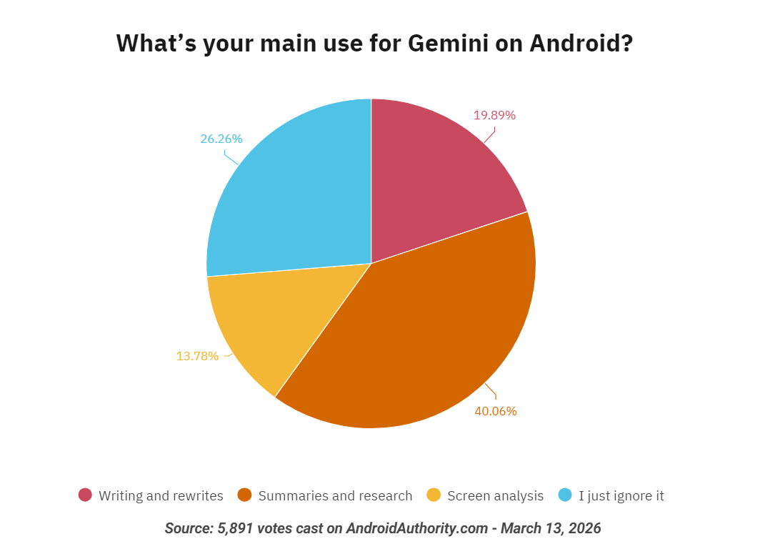 В последние годы смартфоны массово оснащаются встроенными AI-ассистентами, предлагающими удобные генеративные функции. Однако опрос, проведённый изданием Android Authority, показывает, что значительная часть пользователей ими не пользуется.