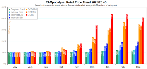 Несмотря на это, говорить о возвращении к «нормальным» ценам пока рано. В Германии рост цен на DDR5 начался ещё в сентябре прошлого года, а в декабре произошёл резкий скачок. В итоге, текущие цены в среднем всё ещё на 308% выше, чем в июле 2023 года.