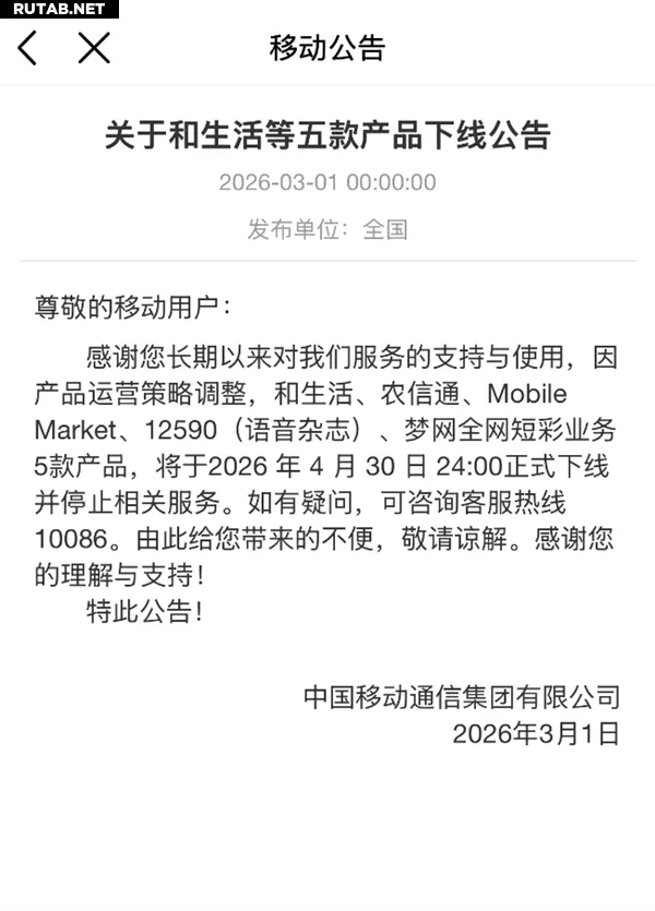 Согласно официальному уведомлению, сервисы «He Shenghuo» (和生活), «Nong Xintong» (农信通), «Mobile Market», «12590» (голосовой журнал) и «Mengwang Quanwang Duancai» (межсетевая служба SMS/MMS) будут окончательно отключены 30 апреля 2026 года в 24:00 по пекинскому времени (19:00 мск). Решение связано с корректировкой продуктовой стратегии компании.