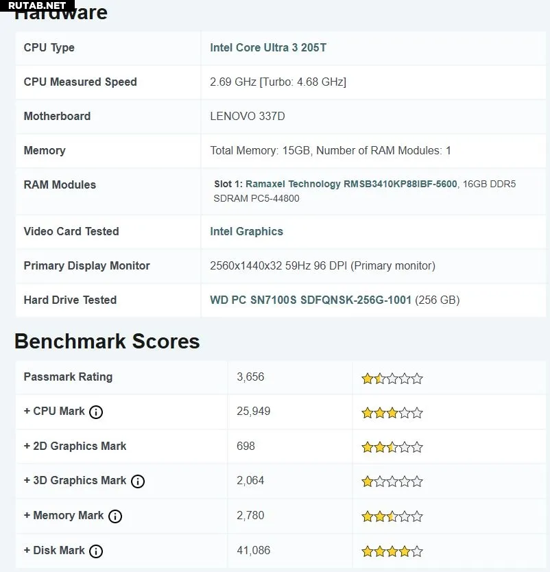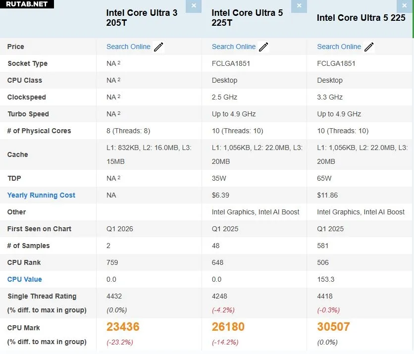 Новинка из линейки Intel Arrow Lake, процессор начального уровня Core Ultra 3 205T, впервые появилась в базе тестов PassMark, показав в однопоточном режиме производительность на 4% выше, чем у более старшей модели Ultra 5 225T.