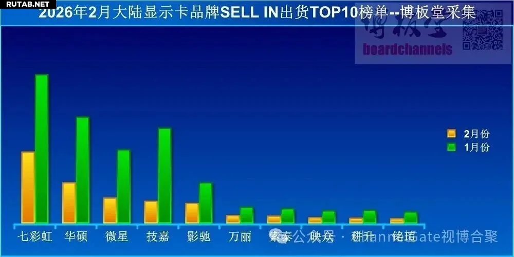 Что касается конкретных брендов, то топ-10 по объёмам отгрузок в феврале выглядел следующим образом: Colorful (七彩虹), ASUS (华硕), MSI (微星), GIGABYTE (技嘉), GALAX (影驰), Manli (万丽), ZOTAC (索泰), INNO3D (映众), Gainward (耕升) и MAXSUN (铭瑄).