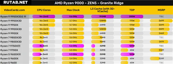 Параллельно с этим AMD также готовит к выходу процессоры Ryzen 7 9750X и Ryzen 5 9650X, которые станут обновлёнными версиями Ryzen 7 9700X и Ryzen 5 9600X соответственно. Их максимальная частота будет повышена на 100 МГц (до 5.6 ГГц и 5.5 ГГц), базовая частота — на 400 МГц (до 4.2 ГГц и 4.3 ГГц), а TDP увеличится с 65 Вт до 120 Вт.