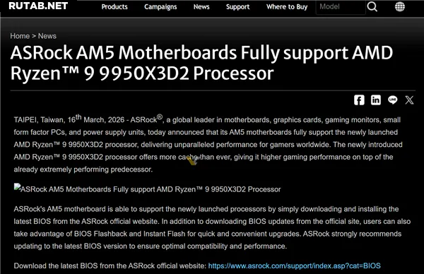 Точная дата выхода долгое время оставалась неизвестной, но, судя по всему, анонс уже близок. На это указывает тот факт, что на официальном сайте компании ASRock неожиданно появился, а затем был удалён пресс-релиз, в котором сообщалось о полной поддержке нового Ryzen 9 9950X3D2 всеми материнскими платами на сокете AM5.