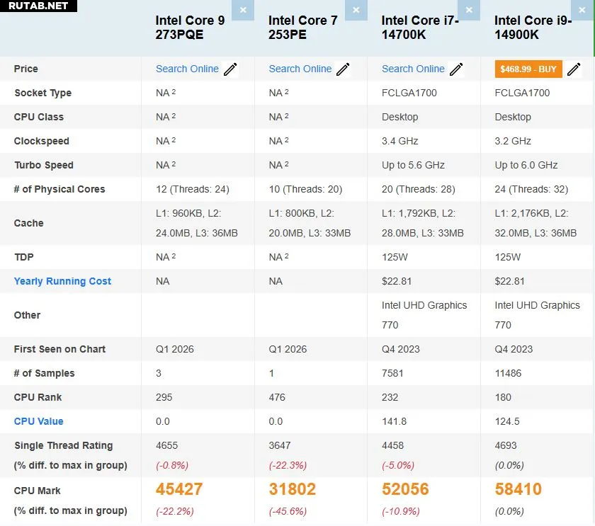 В базе тестовой программы PassMark появились первые результаты производительности флагманского процессора Intel Core 9 273PQE, принадлежащего к новому семейству Bartlett Lake. Оно было официально представлено на прошлой неделе и отличается полным отказом от энергоэффективных ядер в пользу использования исключительно производительных ядер. Хотя эти чипы изначально проектировались для профессиональных устройств, последние синтетические данные показывают их огромный потенциал, который, несомненно, нашёл бы признание и на потребительском рынке.