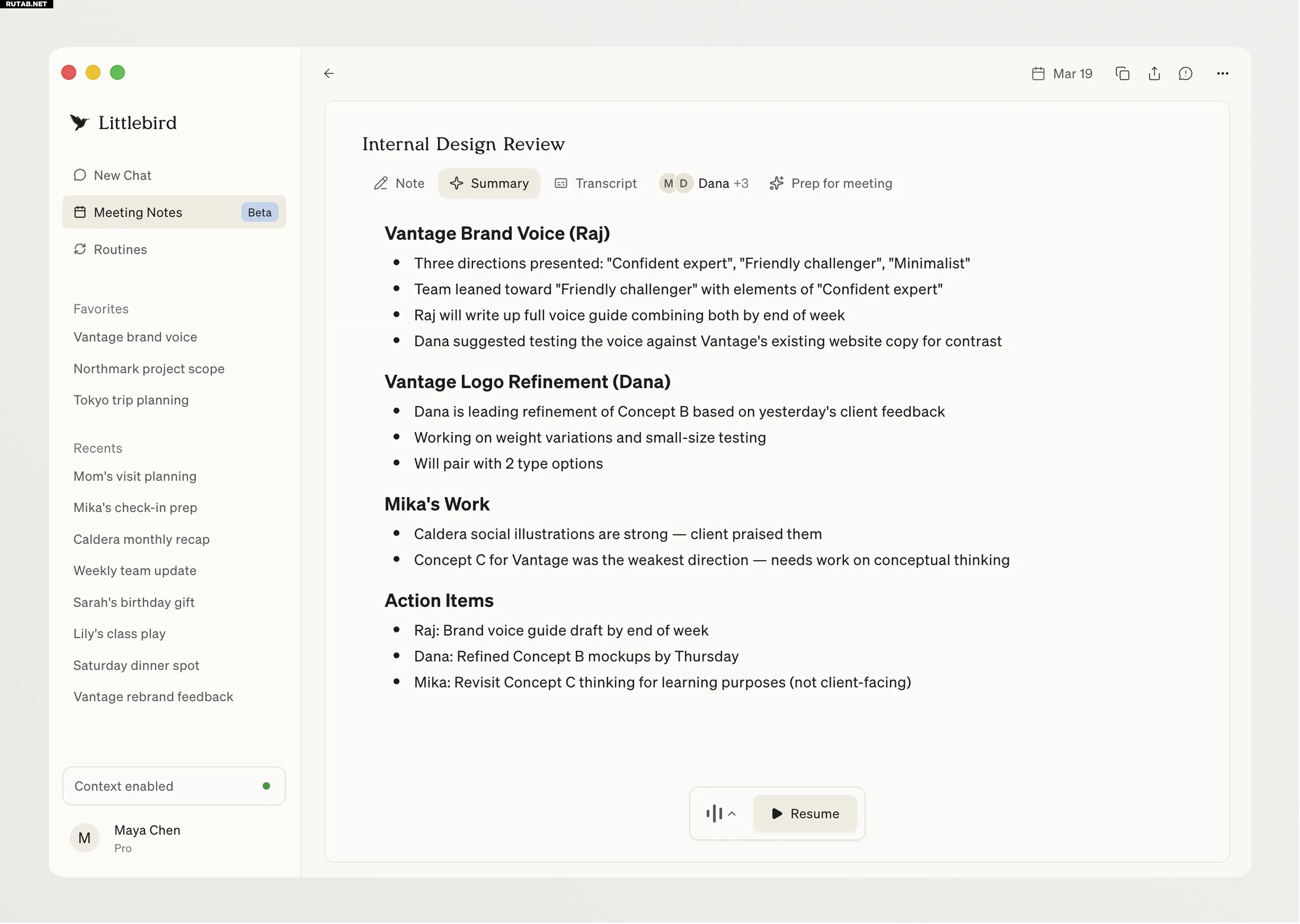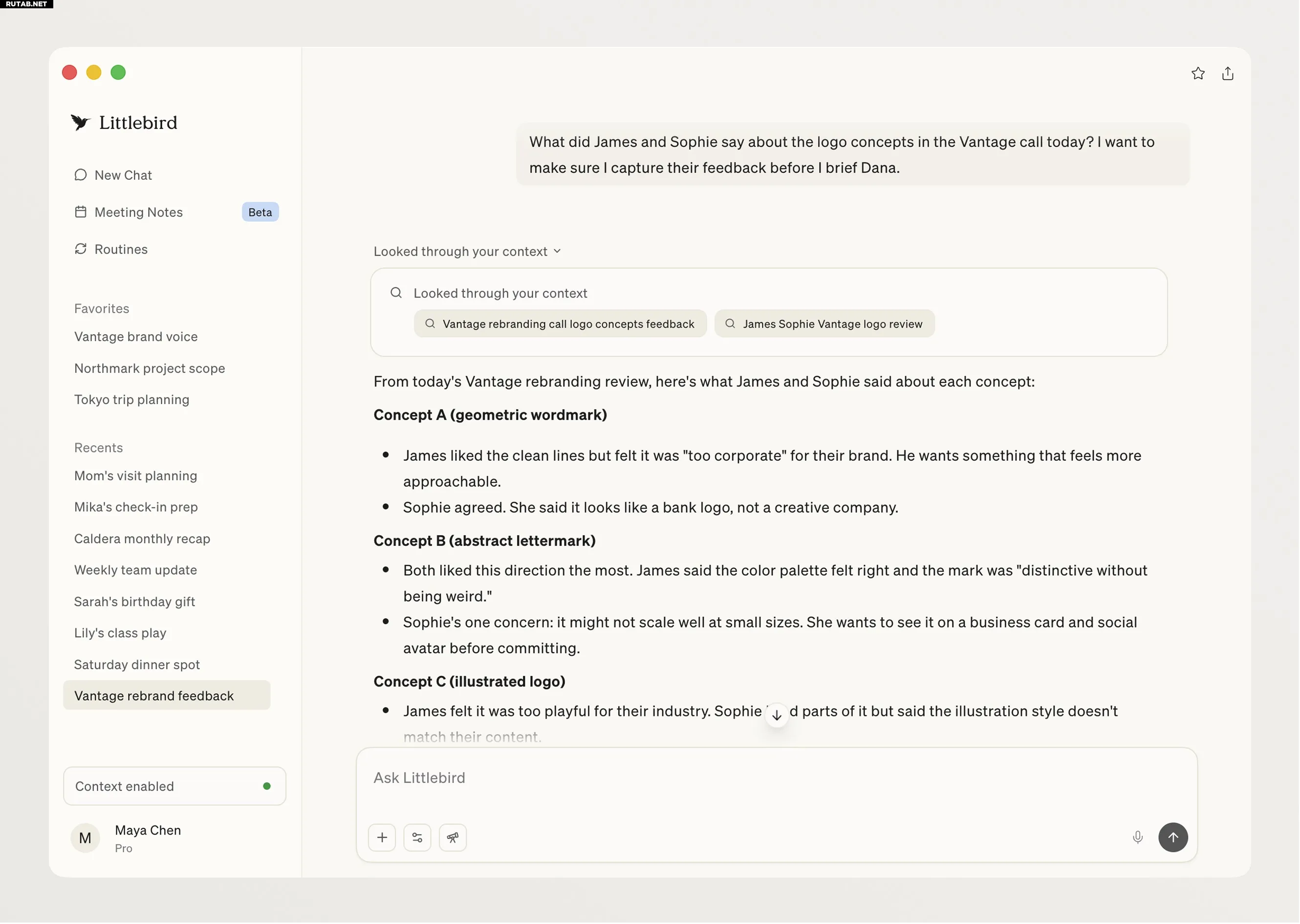 В Littlebird также встроен инструмент для создания заметок на основе транскрипции встреч и функция «Подготовка к встрече», которая анализирует историю переписки и даже мнения пользователей Reddit о продукте или компании.