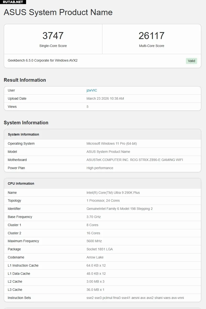 Согласно данным тестов, Ultra 9 290K Plus набирает 3747 баллов в однопоточном тесте Geekbench и 26117 баллов в многопоточном. По сравнению с Ultra 9 285K это означает прирост производительности примерно на 17% как в одноядерной, так и в многоядерной нагрузке.