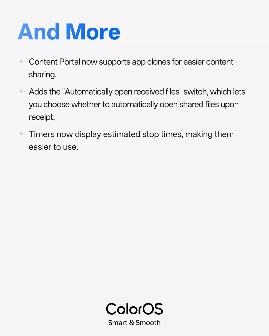 Дополнительные обновления сосредоточены на небольших, но полезных изменениях. «Портал контента» теперь поддерживает клоны приложений, позволяя более плавно обмениваться контентом между дубликатами приложений, используемых для нескольких аккаунтов. Новый переключатель позволяет пользователям решать, должны ли полученные файлы открываться автоматически, добавляя уровень контроля над входящим контентом. Эти изменения призваны уменьшить трение в повседневном использовании, а не внести серьёзные изменения в интерфейс.