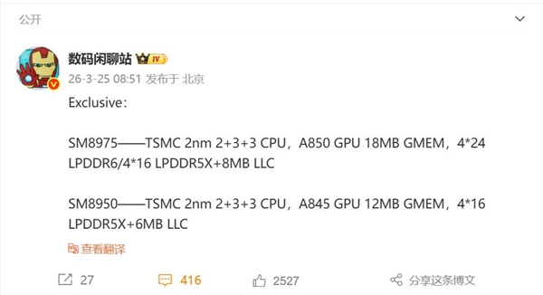 Флагманская версия Snapdragon 8E6 Pro получит графический процессор Adreno 850, 18 МБ видеопамяти и 8 МБ кэша последнего уровня. Кроме того, этот чип станет первым на рынке с поддержкой памяти LPDDR6.