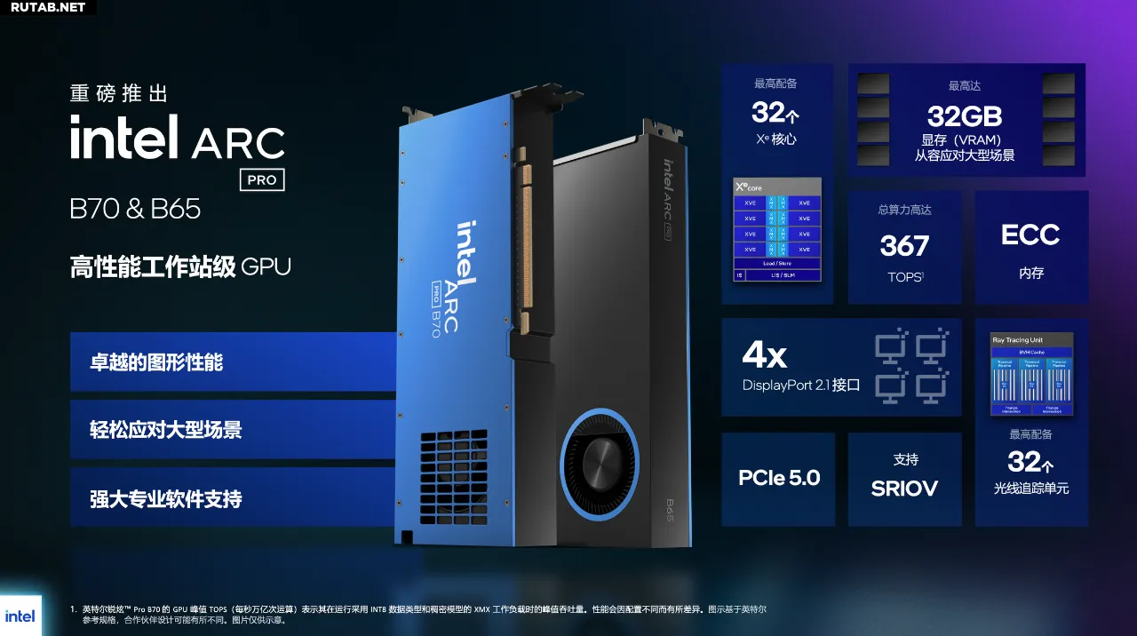Arc Pro B65 использует урезанную версию GPU BMG-G31 с 20 блоками Xe и 160 движками XMX, обеспечивая пиковую производительность 197 TOPS при энергопотреблении платы 200 Вт. При этом она сохраняет объём памяти в 32 ГБ GDDR6.