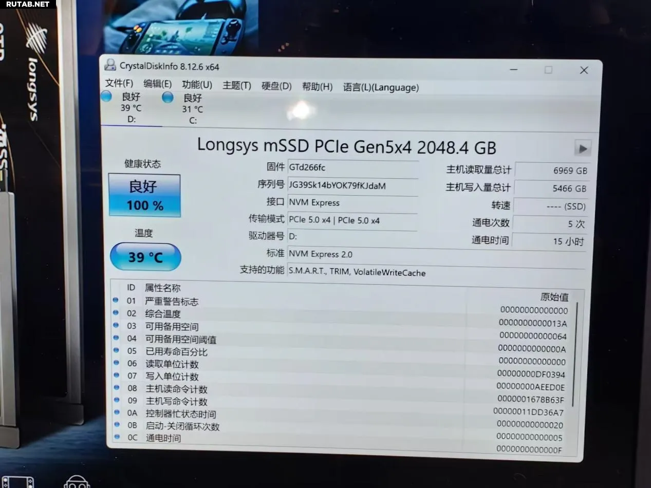 Согласно скриншоту из CrystalDiskInfo, модель диска — «Longsys mSSD PCIe Gen5x4 2048.4 GB». Он поддерживает стандарт NVMe 2.0 и работает на шине PCIe 5.0 x4, а его температура при демонстрации составляла всего 39°C.