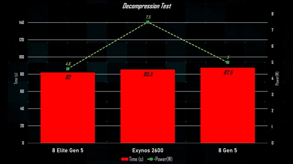 Даже в тесте на распаковку Exynos 2600 не показал улучшений в эффективности. Его пиковое энергопотребление достигло 7,8 Вт, в то время как Snapdragon 8 Gen 5 и Snapdragon 8 Elite Gen 5 остались ниже 5 Вт. Snapdragon 8 Elite Gen 5 также тратит меньше времени на распаковку.