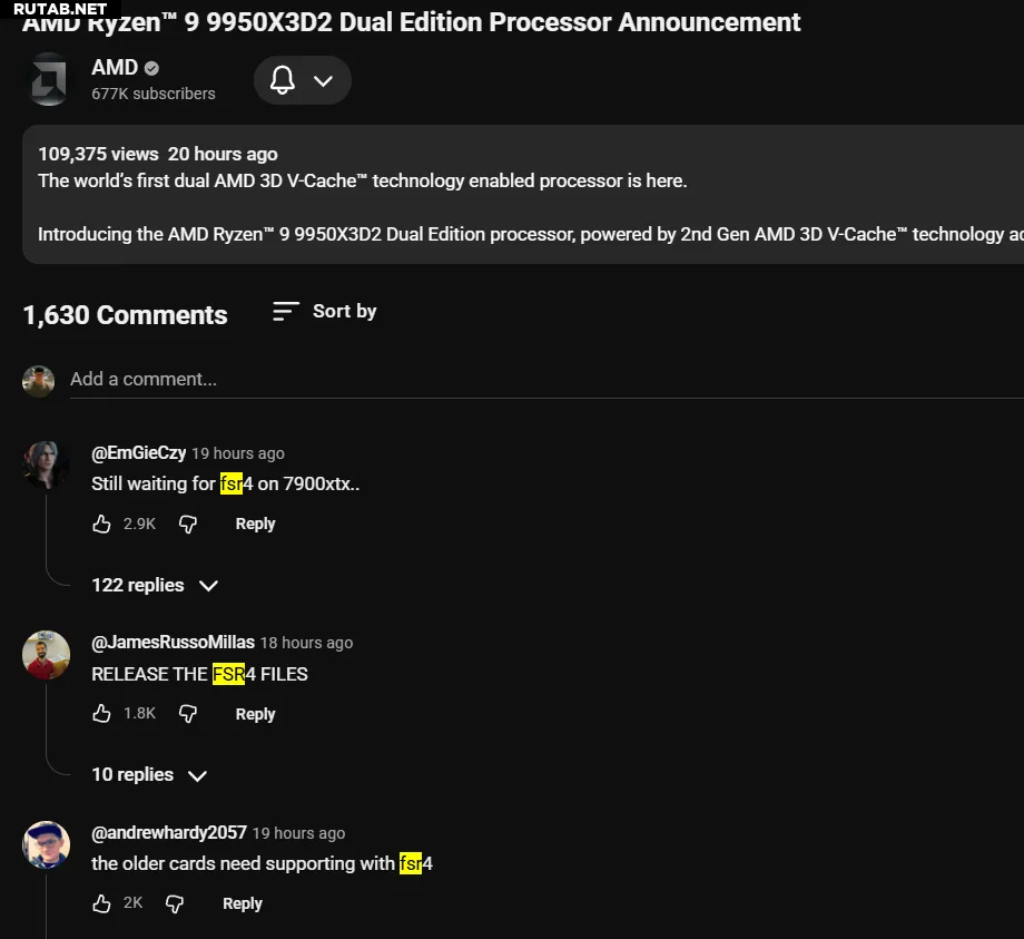По данным статистики Videocardz, под видео набралось более 1000 комментариев, и почти треть из них — это требования к AMD обеспечить поддержку технологии FSR 4 для старых видеокарт архитектур RDNA 3 и RDNA 2. Обсуждение самого процессора заняло лишь около трети от общего числа откликов.