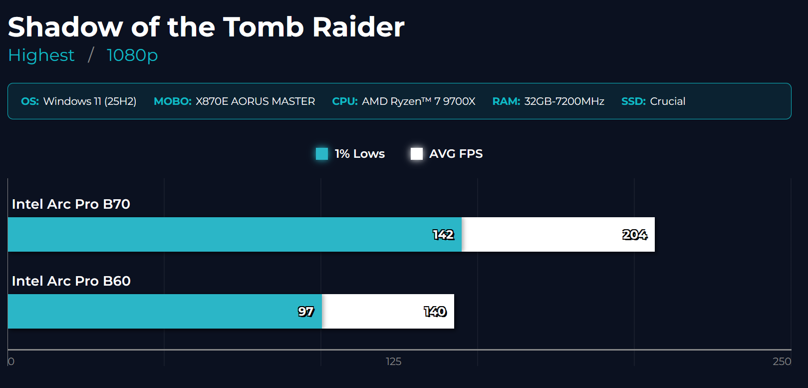 Результаты показали, что средняя частота кадров у Arc Pro B70 в среднем на 45.0% выше, чем у предыдущей модели Arc Pro B60, а показатель 1% Low FPS вырос на 45.8%. Этот отрыв стабильно наблюдался во всех тестовых сценариях, как в Full HD, так и в Quad HD.