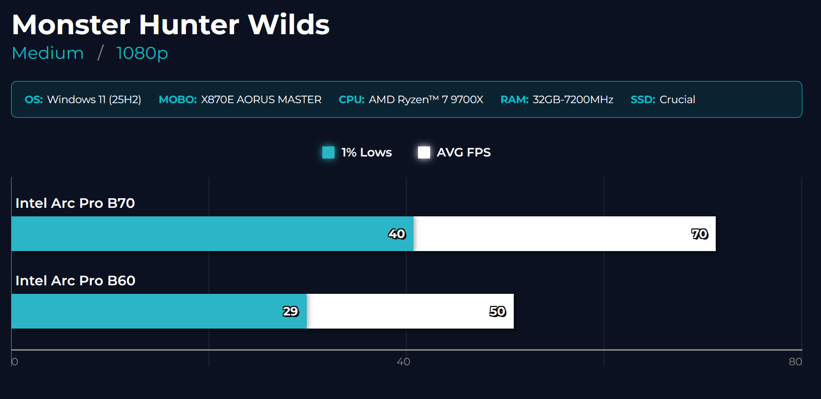 Ресурс Level1Techs провёл игровые тесты Arc Pro B70 в таких проектах, как Monster Hunter: Wilds, Shadow of the Tomb Raider и Cyberpunk 2077, на разрешениях 1080p и 1440p.