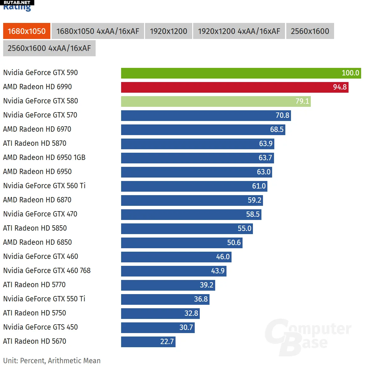 Согласно тестовым данным ComputerBase, в разрешении 1680×1050 GTX 590 лидировала с общим индексом 100.0 против 94.8 у HD 6990.