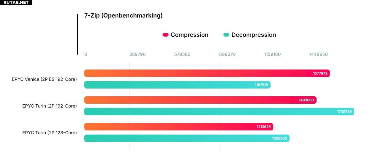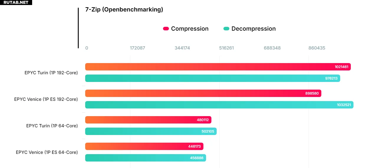 Второй образец (100-000001863-02) имеет 64 ядра и 128 потоков, работает в паре с 4 модулями DDR5-6400 по 64 ГБ. Оба чипа проходили тестирование в бенчмарке сжатия 7-Zip.