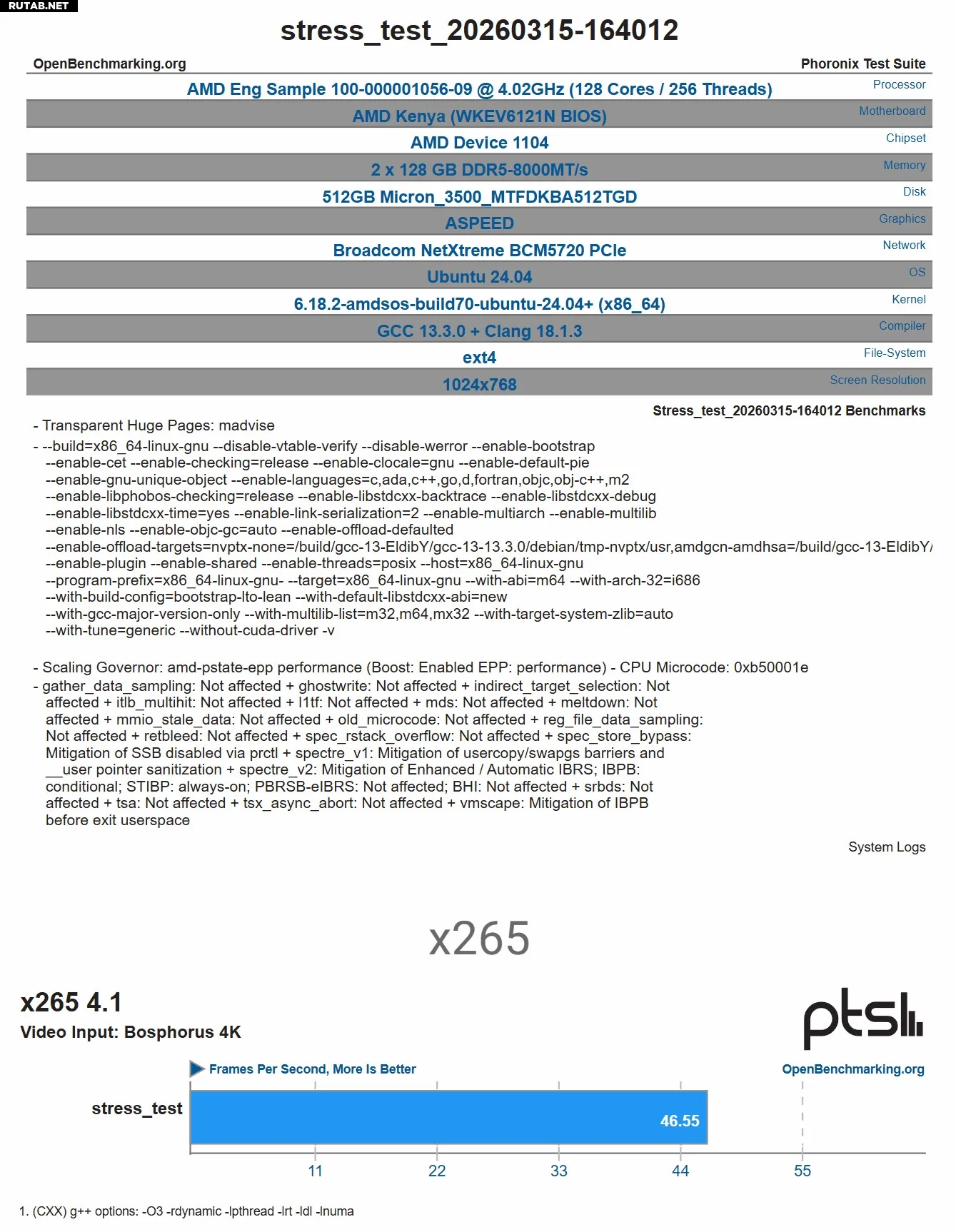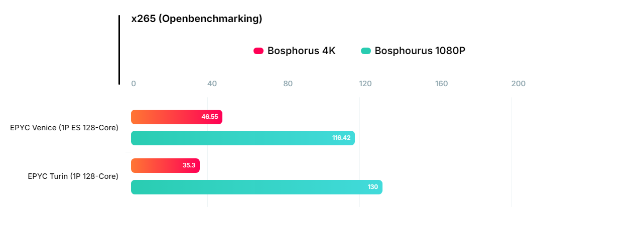 На платформе Kenya тестировался образец «100-000001056-09» с 128 ядрами и 256 потоками, также работающий на частоте 4,02 ГГц. Он использовал два модуля памяти DDR5-8000 по 128 ГБ и проходил тест кодирования видео x265.