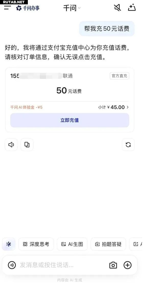 Процесс максимально упрощен: пользователю достаточно в приложении Qwen сказать или написать фразу вроде «пополнить телефон на 50 юаней». Система автоматически создаст заказ на пополнение. После проверки номера и суммы останется лишь нажать кнопку «Пополнить сейчас» для завершения транзакции через Alipay AI Pay с подтверждением по лицу, отпечатку пальца или паролю.
