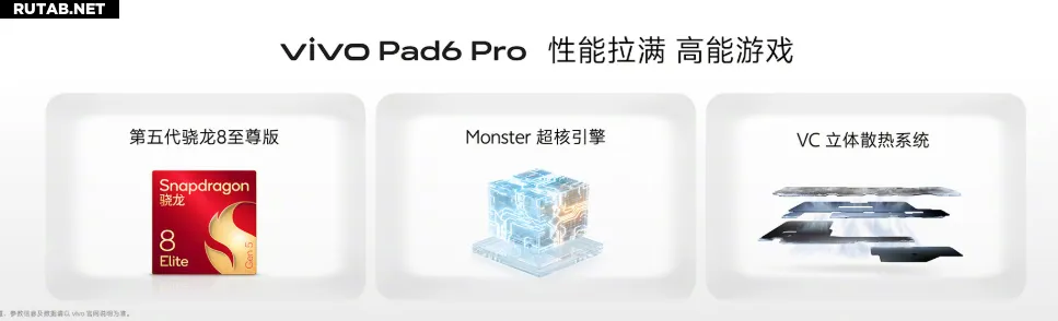 В основе планшета лежит флагманский чипсет Snapdragon 8 Gen 5, созданный по 3-нм техпроцессу. По данным производителя, устройство набирает в бенчмарке AnTuTu более 4,2 миллиона баллов. Комплектующие дополняют оперативная память LPDDR5X и накопитель UFS 4.1. Для отвода тепла используется система охлаждения общей площадью 71446 мм², состоящая из паровой камеры и сверхпроводящего графитового слоя.