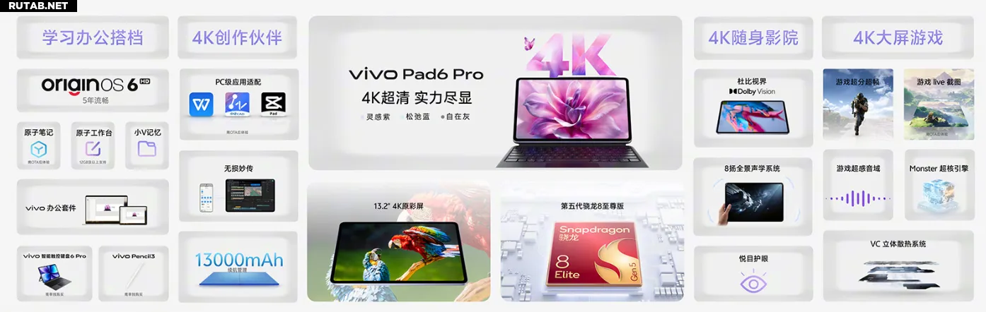 Для творчества и работы поддерживается стилус vivo Pencil 3 с 4096 уровнями нажатия, сверхнизкой задержкой и датчиком наклона, а также интеллектуальная магнитная клавиатура. Предустановленная операционная система OriginOS 6 HD позволяет одновременно работать с пятью окнами в режиме Atomic Workbench. Планшет изначально совместим с профессиональными версиями WPS и CapCut для ПК, поддерживая удобный обмен файлами и взаимодействие между устройствами.