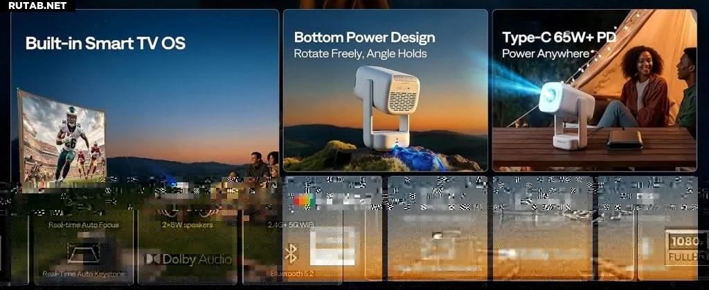 Питание осуществляется через углублённый порт USB Type-C с поддержкой Power Delivery мощностью 65 Вт. Это позволяет проектору работать от совместимых зарядных устройств для ноутбуков или портативных аккумуляторов, делая его пригодным для использования в разных комнатах или на открытом воздухе без привязки к розетке.