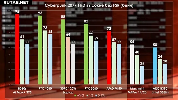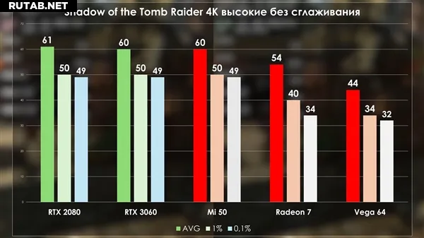 Тестирование показало, что игровая производительность карты примерно соответствует уровню GeForce RTX 3060, с небольшими отклонениями в ту или иную сторону в зависимости от игры. Это ожидаемо, так как Radeon VII, на которой основана MI50, также немного превосходит RTX 3060.