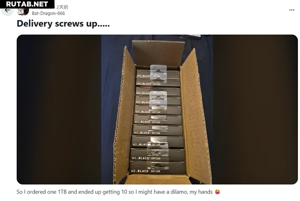 История была опубликована на форуме Reddit пользователем под ником u/Bat-Dragon-666, который выложил фотографию целой коробки с NVMe-накопителями. Он заказал всего один SSD Western Digital WD_Black SN7100, но при доставке получил десять идентичных устройств.