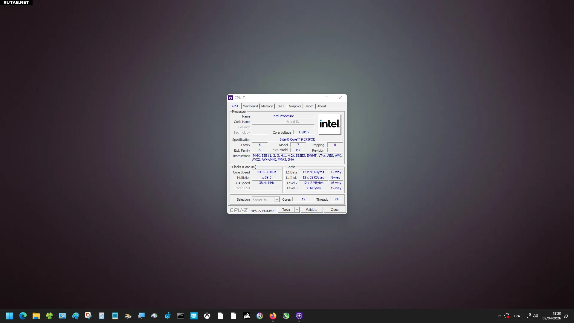 Официальные спецификации Intel Core 9 273PQE: 12 ядер (только производительных P-cores) и 24 потока, максимальная турбочастота 5.9 ГГц, кэш-память 36 МБ, базовое тепловыделение 125 Вт.