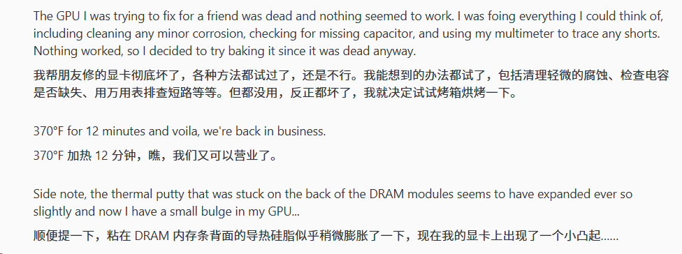 В итоге он поместил видеокарту в бытовую духовку, разогретую до 188°C, на 12 минут. После извлечения и сборки карта успешно запустилась.