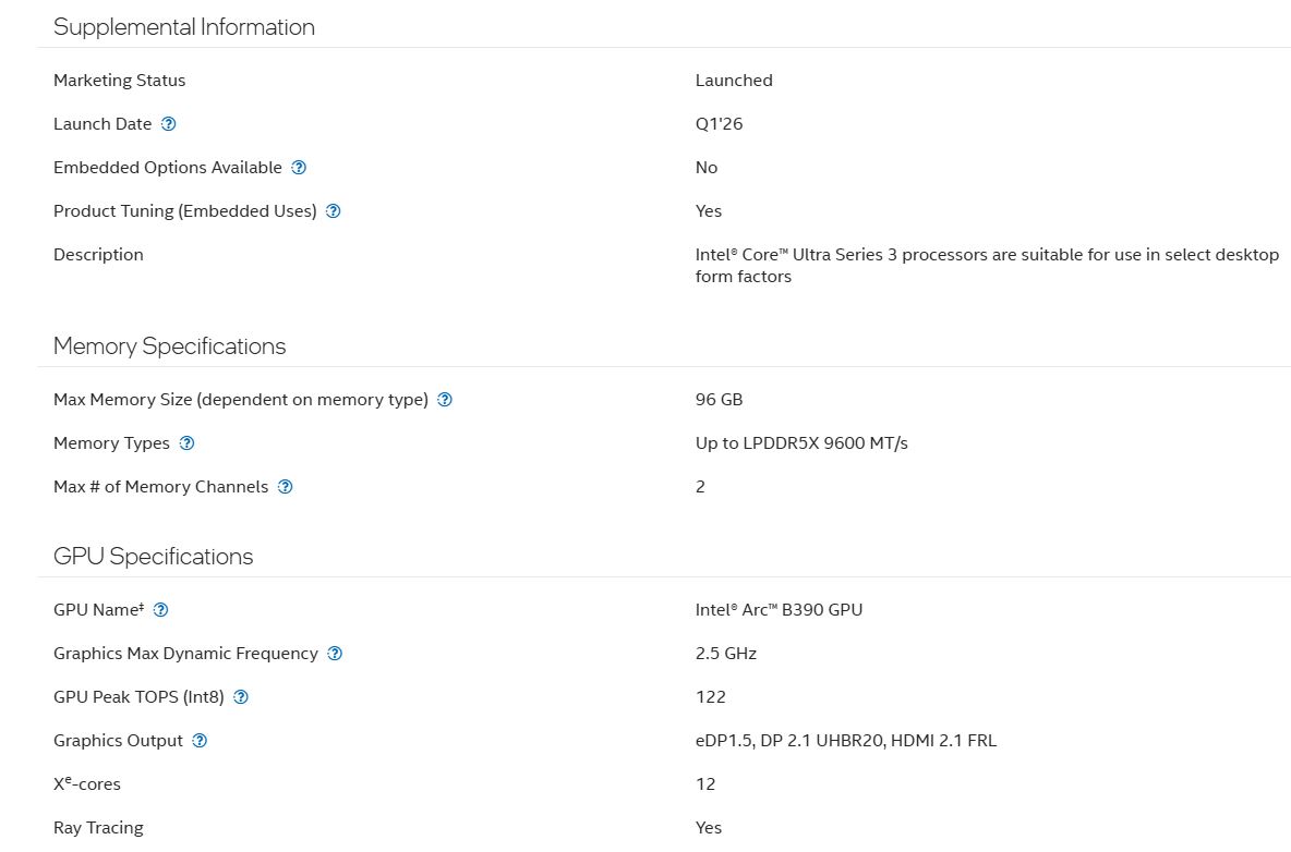 Тактовая частота в режиме максимальной нагрузки достигает 5,0 ГГц, а процессор имеет в своём распоряжении 18 МБ кэш-памяти третьего уровня. Базовое энергопотребление определено в 25 Вт, тогда как максимальное значение в пике нагрузки составляет 80 Вт. За генерацию графики отвечает интегрированный чип Intel Arc B390, который предлагает 12 современных ядер в архитектуре Xe3.