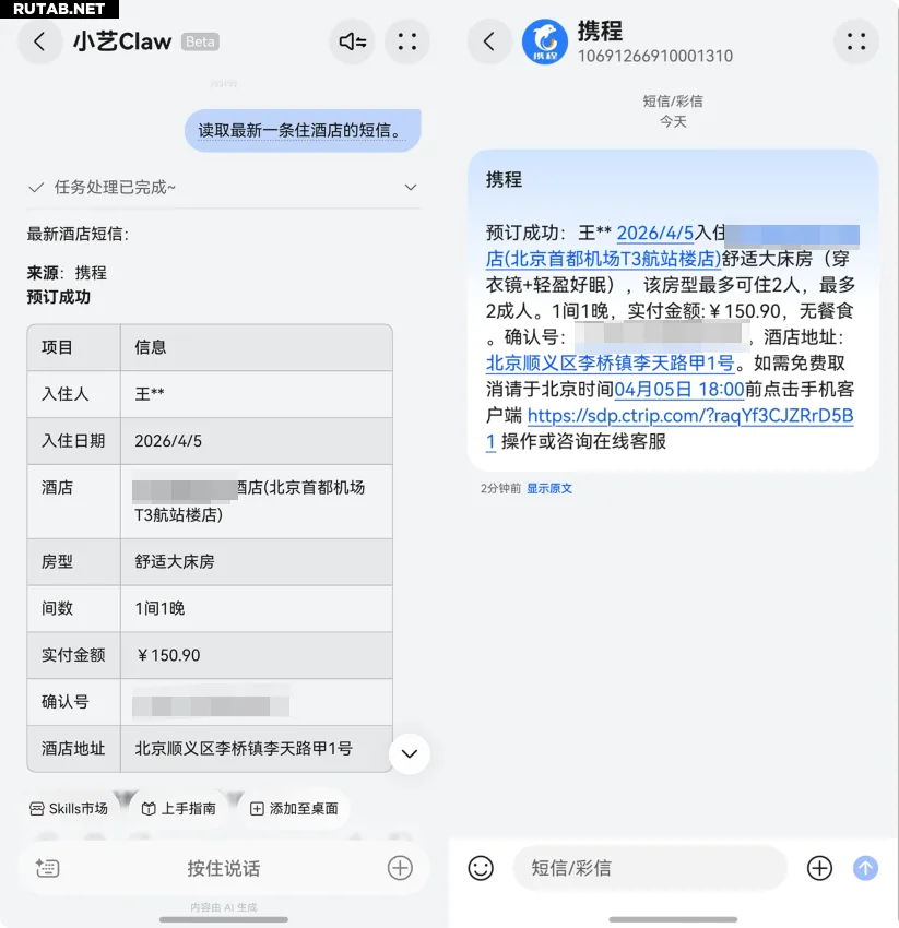 Внутренняя тестовая версия также позволяет Xiaoyi Claw обрабатывать SMS. Получив разрешение, ассистент может, например, автоматически извлечь из сообщения от отеля ключевую информацию (даты, адрес, тип номера, стоимость) и оформить её в виде удобной таблицы.