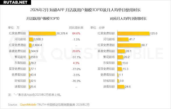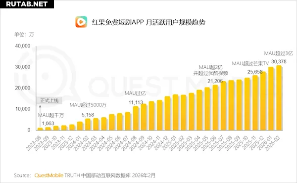 Согласно последнему отчёту QuestMobile о рынке коротких сериалов, месячная аудитория приложения Red Fruit Free Short Drama (红果免费短剧) в феврале 2026 года официально превысила 300 миллионов пользователей, достигнув 304 миллионов.