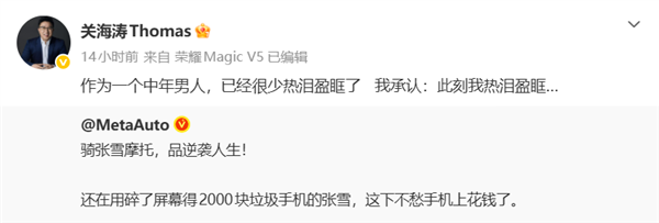 «Ездить на мотоцикле Zhang Xue, вкушать жизнь победителя! Теперь Zhang Xue, который всё ещё пользовался разбитым телефоном за 2000 юаней, не будет беспокоиться о тратах на смартфон», — написал один из пользователей сети.