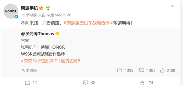 Сам Zhang Xue также лично подтвердил это партнёрство в прямом эфире, торжественно поблагодарив перед камерой: «Особая благодарность Honor за огромную поддержку гоночных мероприятий Zhang Xue Racing, большое спасибо».