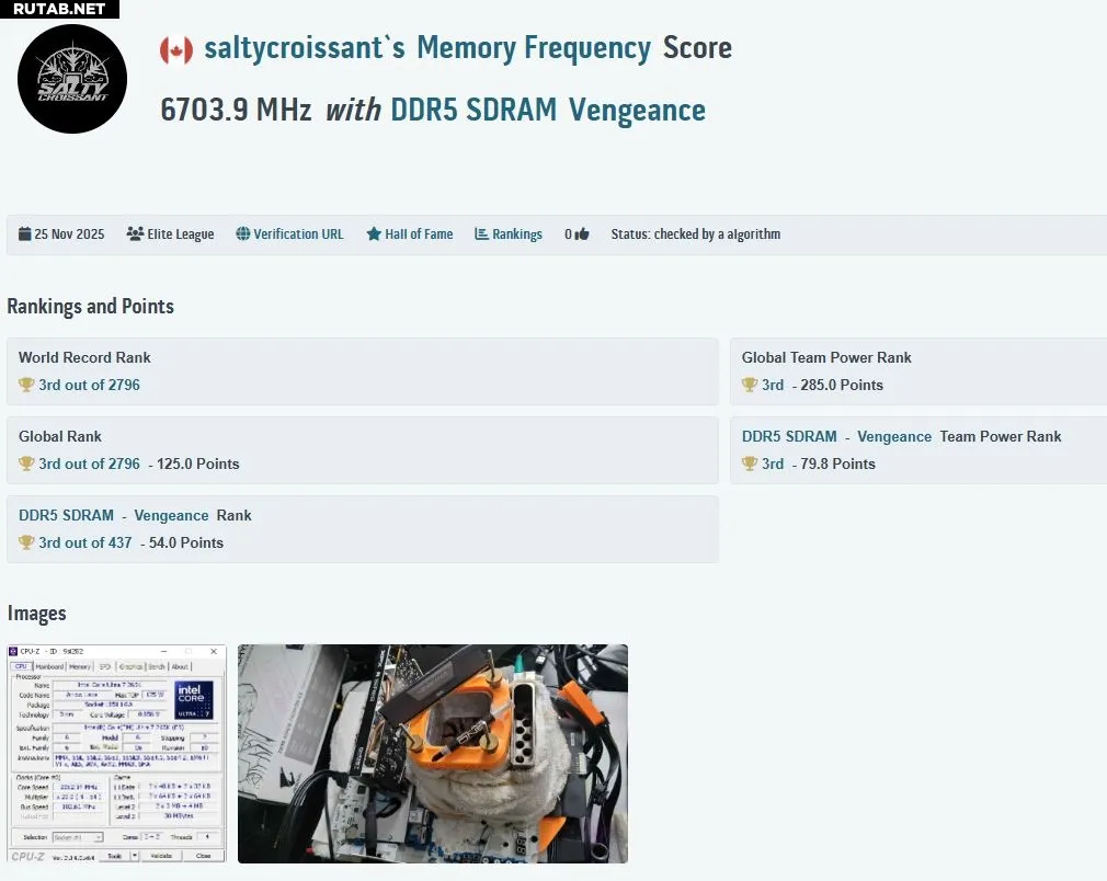 Для сравнения, текущий мировой рекорд для DDR5 составляет 13530 МТ/с. Он был установлен немецким оверклокером sergmann на плате Z890 Aorus Tachyon ICE с применением жидкого азота. Разница между этими результатами составляет всего около 600 МТ/с, что делает достижение Saltycroissant особенно впечатляющим.