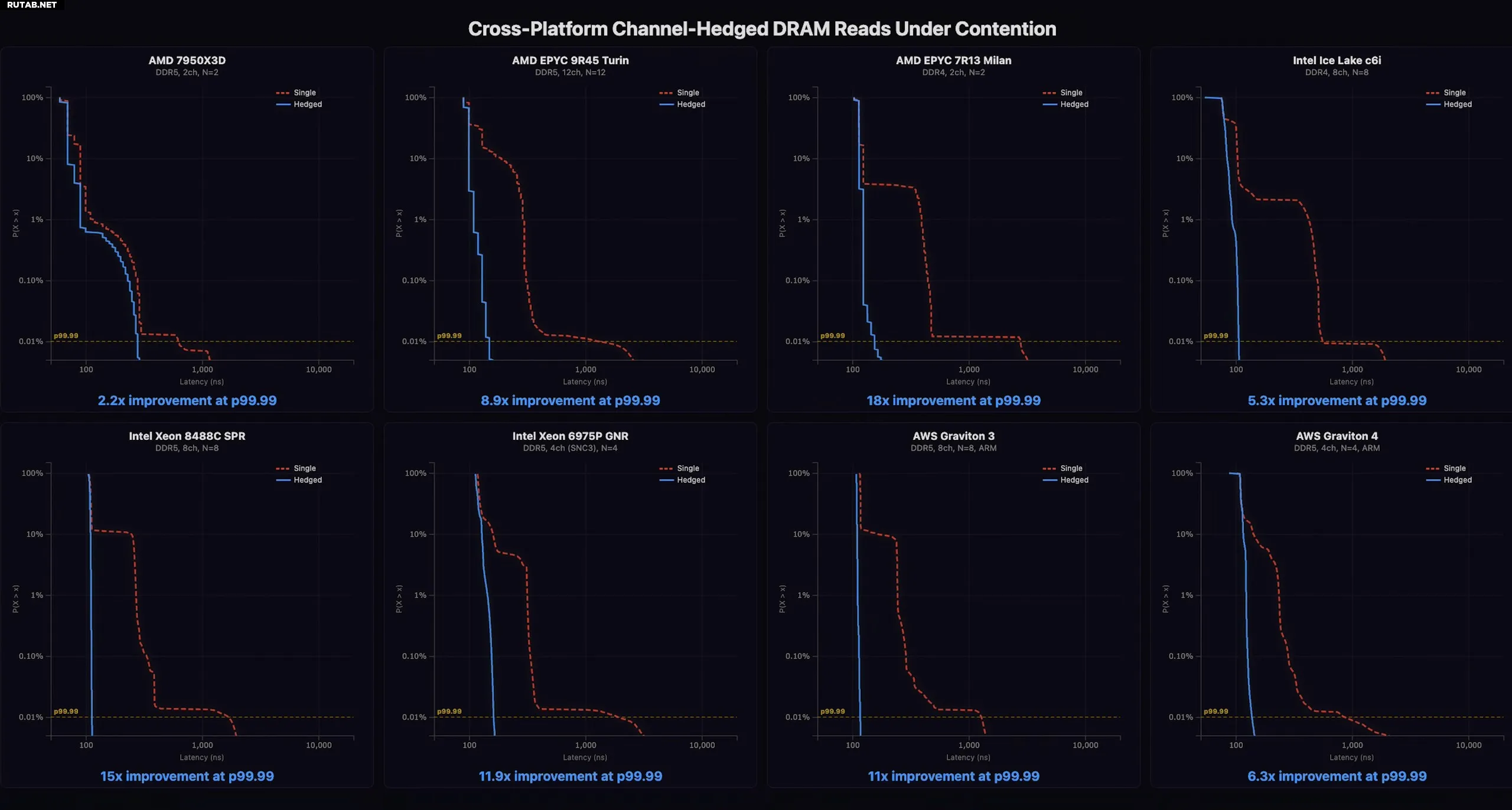 На потребительской системе с Ryzen метод позволил сократить хвостовую задержку более чем вдвое. Тесты на серверных процессорах Amazon AWS показали ещё более впечатляющие результаты благодаря большему количеству каналов памяти. На 12-канальном процессоре AMD EPYC Turin задержка сократилась на 89%. На Intel Xeon (Sapphire Rapids и Diamond Rapids) удалось достичь сокращения на 93,3%, снизив p99.99 задержку с 1697 нс до 113 нс.