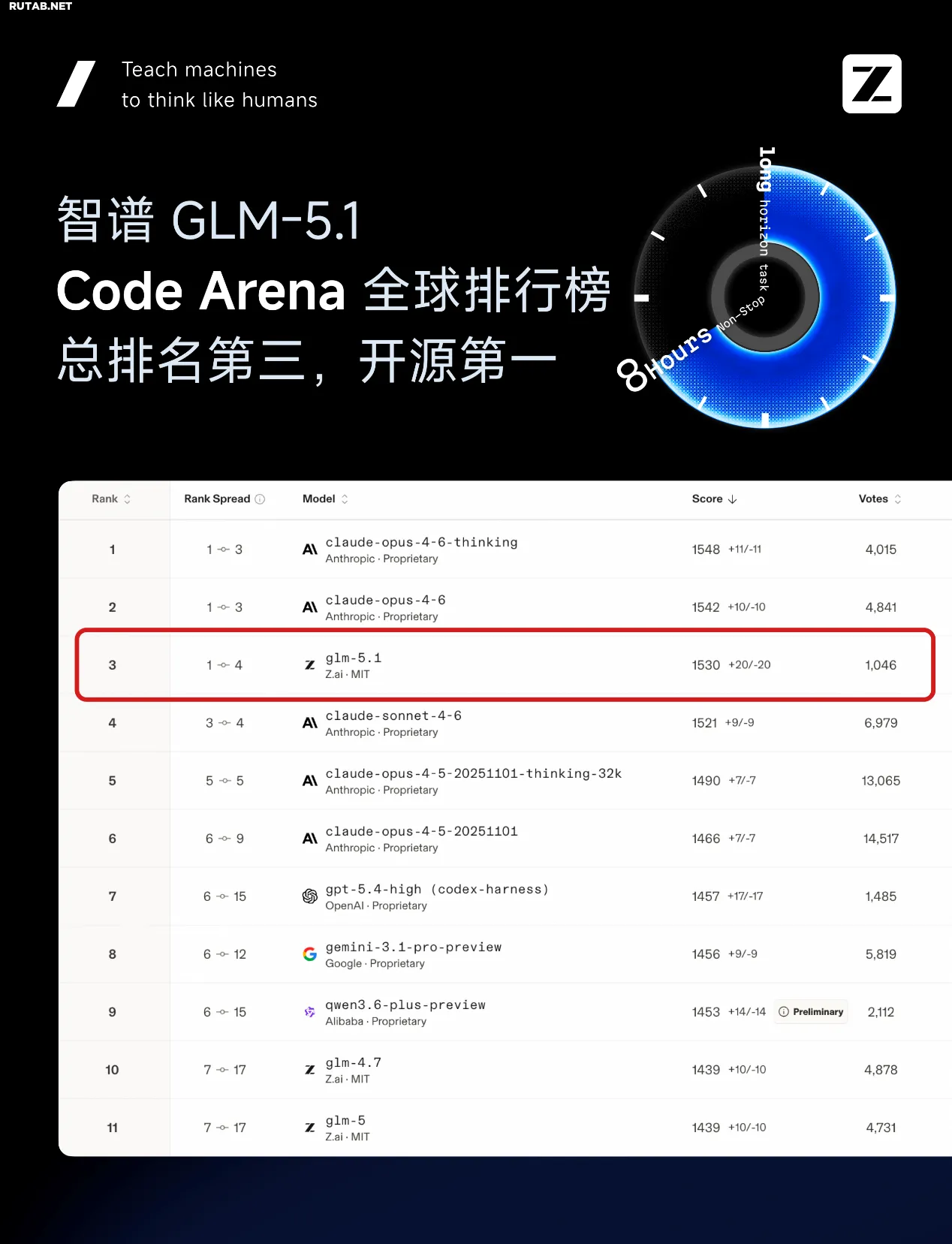 Недавно GLM-5.1 была открыта для сообщества и получила признание разработчиков. Теперь появились свежие рейтинги: авторитетная глобальная платформа для оценки ИИ LMArena (слепое тестирование с участием миллионов пользователей) обновила специализированный рейтинг Code Arena. GLM-5.1 заняла первое место среди открытых моделей в мире и третье место среди всех глобальных моделей.